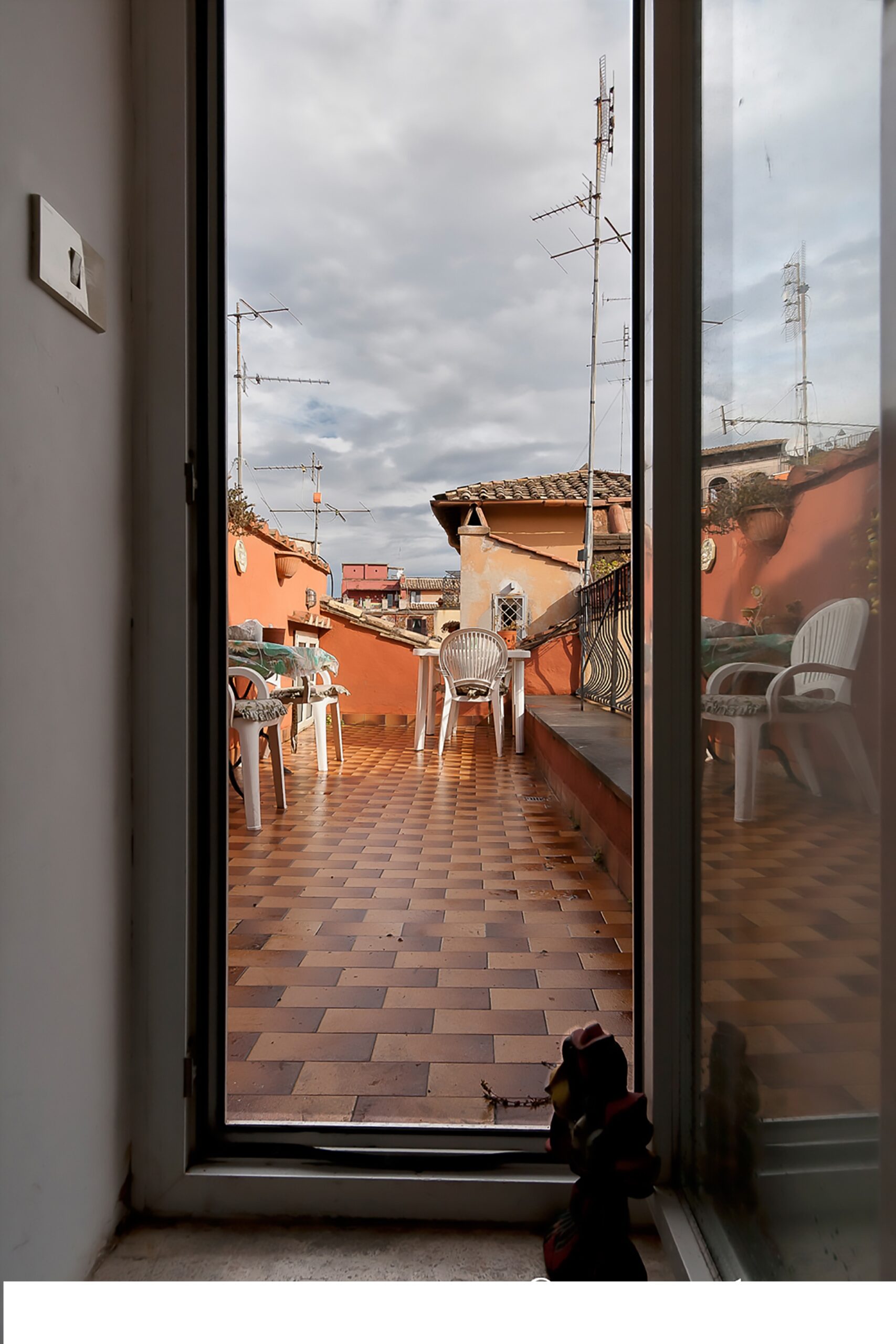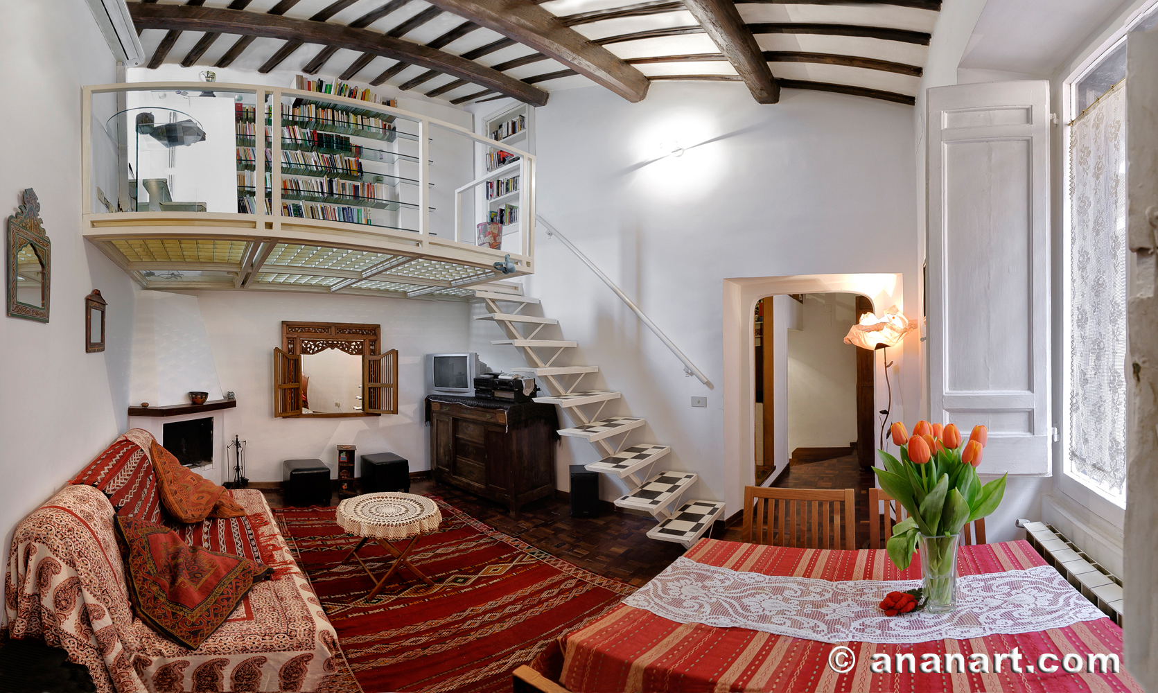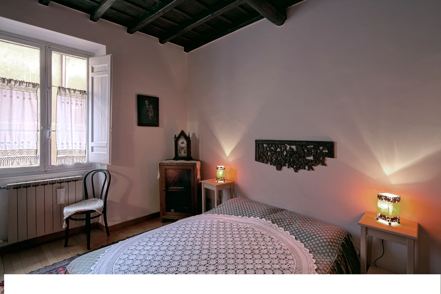La casa, tutta arredata con mobili d’epoca ed etnici, si dispone in tre camere; due da letto, una matrimoniale e una singola, un soggiorno con camino funzionante e divano letto matrimoniale, più cucina, bagno, sala lettura con fornitissima libreria sul soppalco abitabile e un magnifico terrazzo, dove far colazione o cenare, tra i tetti e le cupole dell’antica Roma. Biancheria, una cucina ben attrezzata, lavatrice, tv, stereo, aria condizionata e a richiesta internet e colazione, completeranno di ogni confort la vostra vacanza romana.
